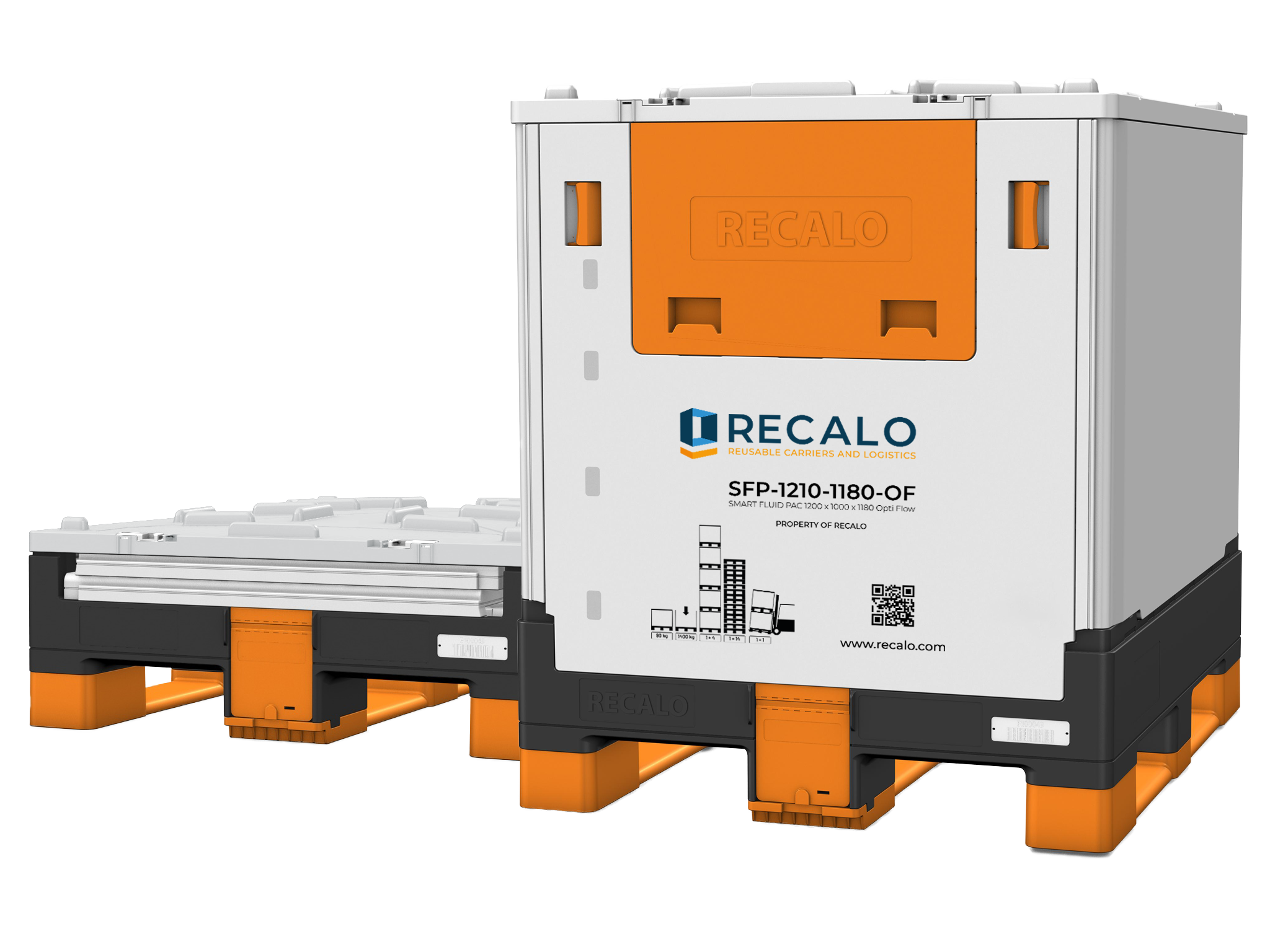 Der SMART FLUID PAC 1200 x 1000 x 1180 OptiFlow (SFP-1210-1180-OF) hat die Außendimensionen von 1200 x 1000 x 1180 mm (L x B x H). Eine Kapazität von ca. 1040 L und 3000 kg dynamischer Auflast sorgen für eine optimierte Platz- sowie Lastennutzung im Straßen sowie Schienenverkehr. Im gefalteten Zustand können bis zu acht gefaltete SFP-1210-1180-OF in einem Standard-LKW mit drei Metern Innenhöhe geladen werden. Dies verringert die Kosten für die Rückwärtslogistik teils signifikant und reduziert die Umweltbelastung.